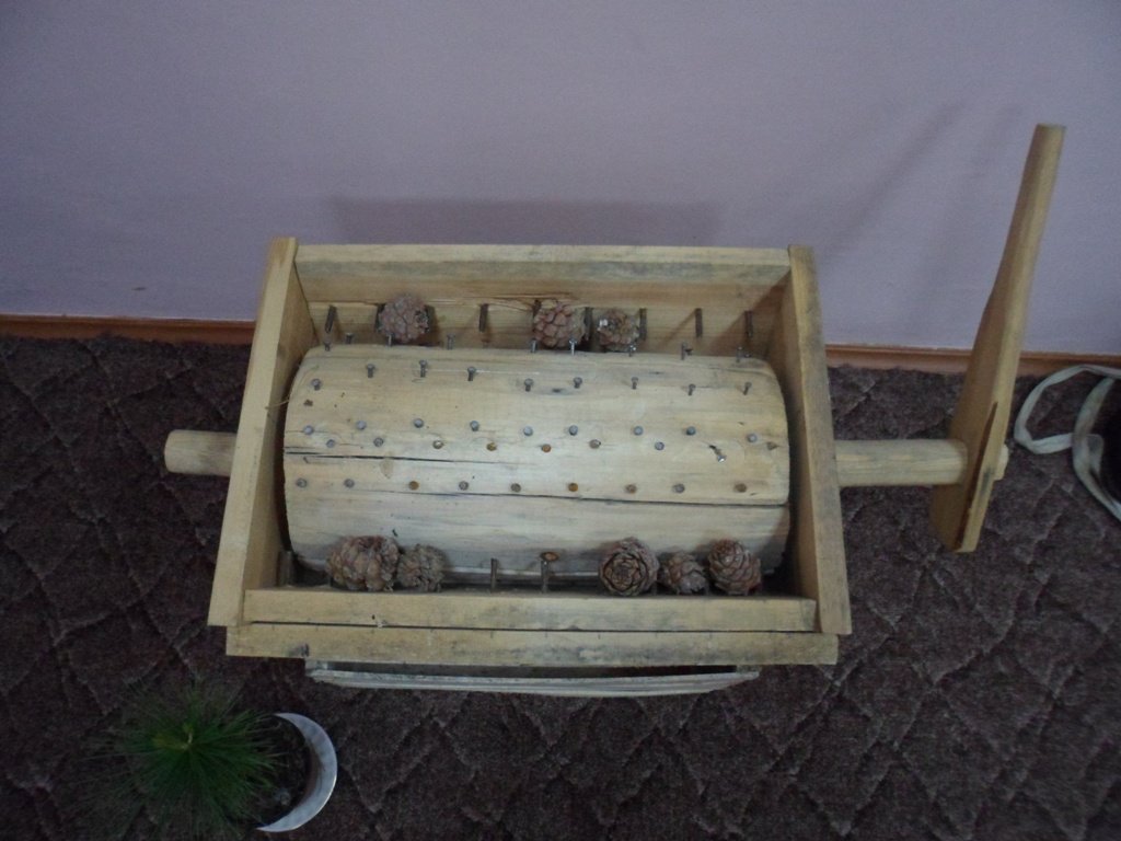 - Дробление «теркой» или «мельницей». Приспособление представляет собой короб с валом внутри, через который пропускают шишки. Вращаясь там, они дробятся, и чешуйки отделяются от орехов. Внизу подстилают пленку, куда падают очищенные семена.